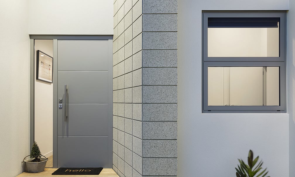 Cutting the ribbon in time for the mince pies, the craftsmanship of the Grey’s home is evident from the minute you approach the exposed aggregate driveway. The entrance way hints at the contemporary design to come with the honed and sealed stack bond feature wall forming a path to the front door under warm and purposeful lighting. Where the internal access garage lies, another immovable stack bond wall gives the façade strength.